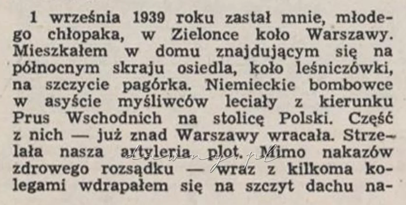 1 września 1939 roku zastał mnie, młodego chłopaka, w Zielonce koło Warszawy. Mieszkałem w domu znajdującym się na północnym skraju osiedla, koło leśniczówki, na szczycie pagórka. Niemieckie bombowce w asyście myśliwców leciały z kierunku Prus Wschodnich na stolicę Polski. Część z nich — już znad Warszawy wracała. Strzelała nasza artyleria plot. Mimo nakazów zdrowego rozsądku — wraz z kilkoma kolegami wdrapałem się na szczyt dachu naszego domu i stamtąd obserwowaliśmy dramatyczną scenerię warszawskiego przedpola.