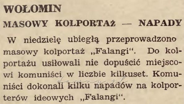 W niedzielę ubiegłą przeprowadzono masowy kolportaż „Falangi“. Do kolportażu usiłowali nie dopuścić miejscowi komuniści w liczbie kilkuset. Komuniści dokonali kilku napadów na kolporterów ideowych „Falangi“. Napady te zostały odparte. W czasie starć padło kilka strzałów. Komuniści rekrutujący się ze skomunizowanych całkowicie fabryk: fabryki łóżek braci Wajman oraz Huty Szklanej „Vitrum“ (właściciele tych fabryk są jednocześnie znani z sympatii komunistycznych) — uzbrojeni byli w rewolwery. Zorganizowani są przeważnie w milicjach klas. Zw. Zaw, popieranych przez swych fabrykantów. Jeden z kolegów kolporterów ideowych kol. Zawadzki został przez Wolskiego Antoniego znanego komunistę i złodzieja ranny.