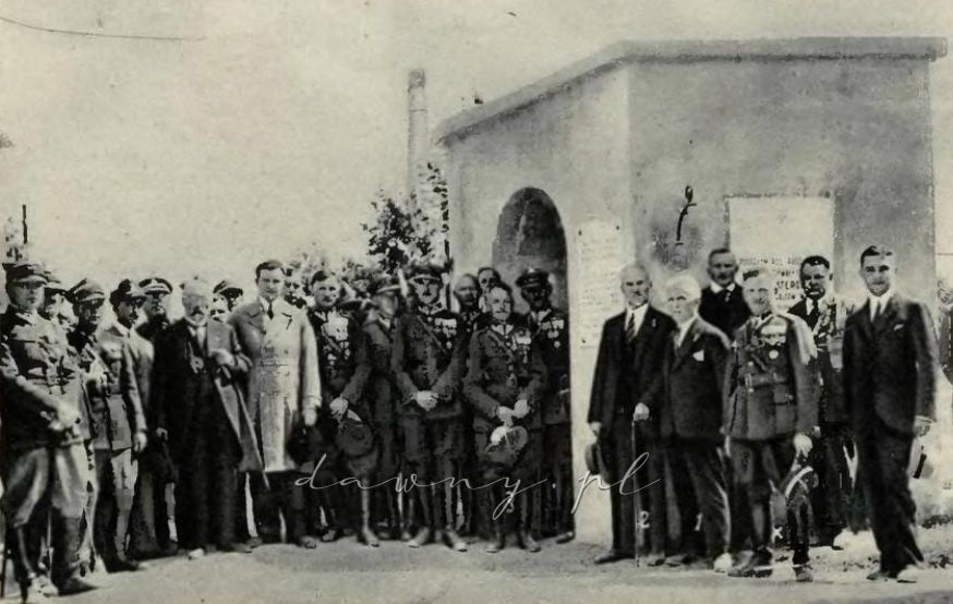 Grupa uczestników uroczystości radzymińskich i b. uczestników walki pod Radzyminem. — M. in. widoczni są płk. Józef Liwacz (x), gen. Branicki b. dow. 5-go p. 8. p. (1), burmistrz Radzymina Marszał (2), płk. Janowski obecny dow. 5.p.s.p.(3).