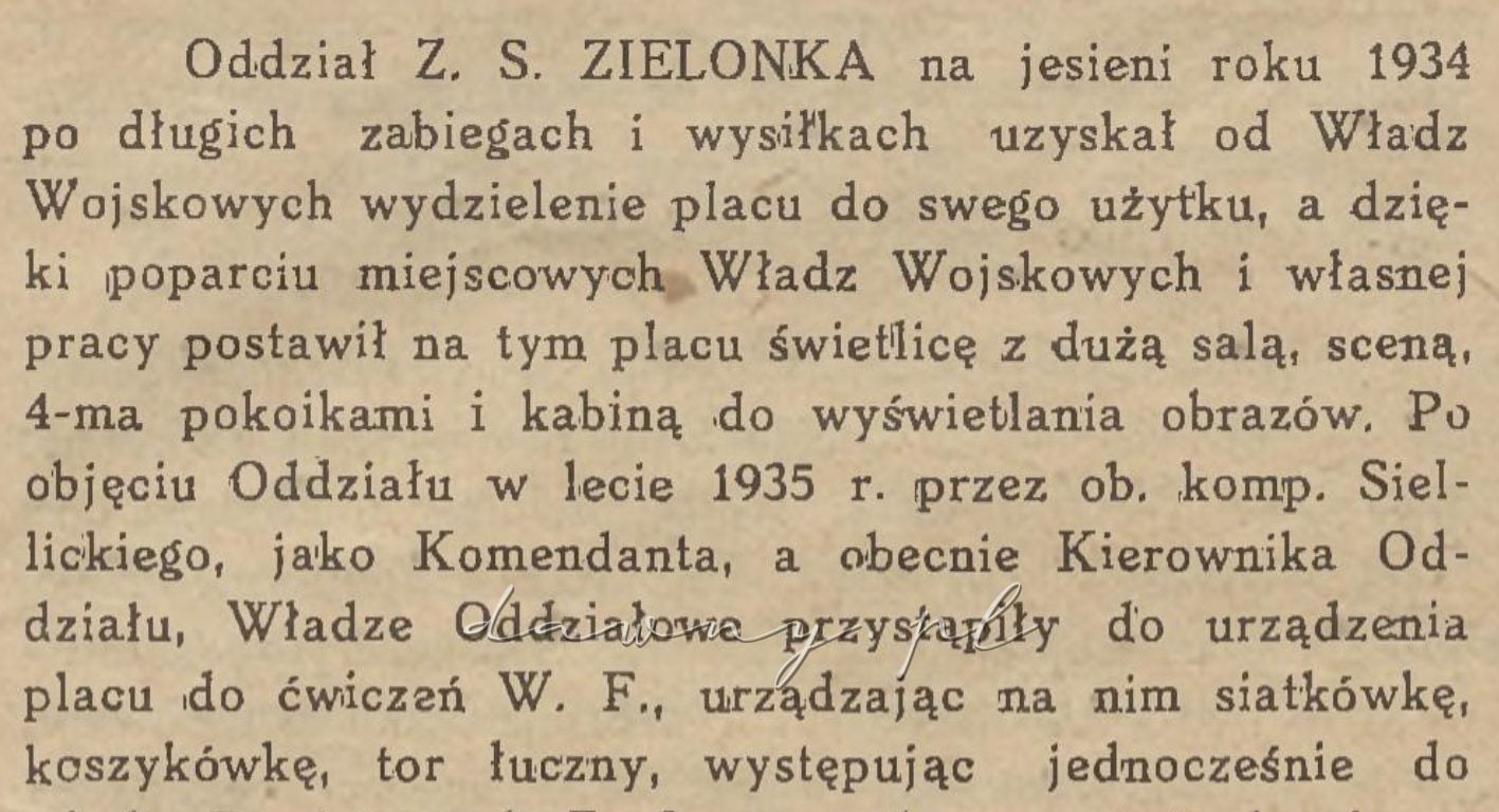 Oddział Z. S. ZIELONKA na jesieni roku 1934 po długich zabiegach i wysiłkach uzyskał od Władz Wojskowych wydzielenie placu do swego użytku, a dzięki poparciu miejscowych władz wojskowych i własnej pracy postawił na tym placu świetlicę z dużą salą, sceną, 4-ma pokoikami i kabiną do wyświetlania obrazów. Po objęciu Oddziału w lecie 1935 r. przez ob, komp. Siellickiego, jako Komendanta, a obecnie Kierownika Oddziału, Władze Oddziałowe przystąpiły do urządzenia placu do ćwiczeń W.F., urządzając ma nim siatkówkę, koszykówkę, tor łuczny, występując jednocześnie do władz Powiatowych Z.S. z prośbą o zatwierdzenie w Zielonce Ośrodka Wychowania Fizycznego dla Gm, Marki, przedstawiając plan dalszej rozbudowy tegoż ośrodka, przewidując w nim boisko, bieżnię, skocznie, rzutnię i t.p.