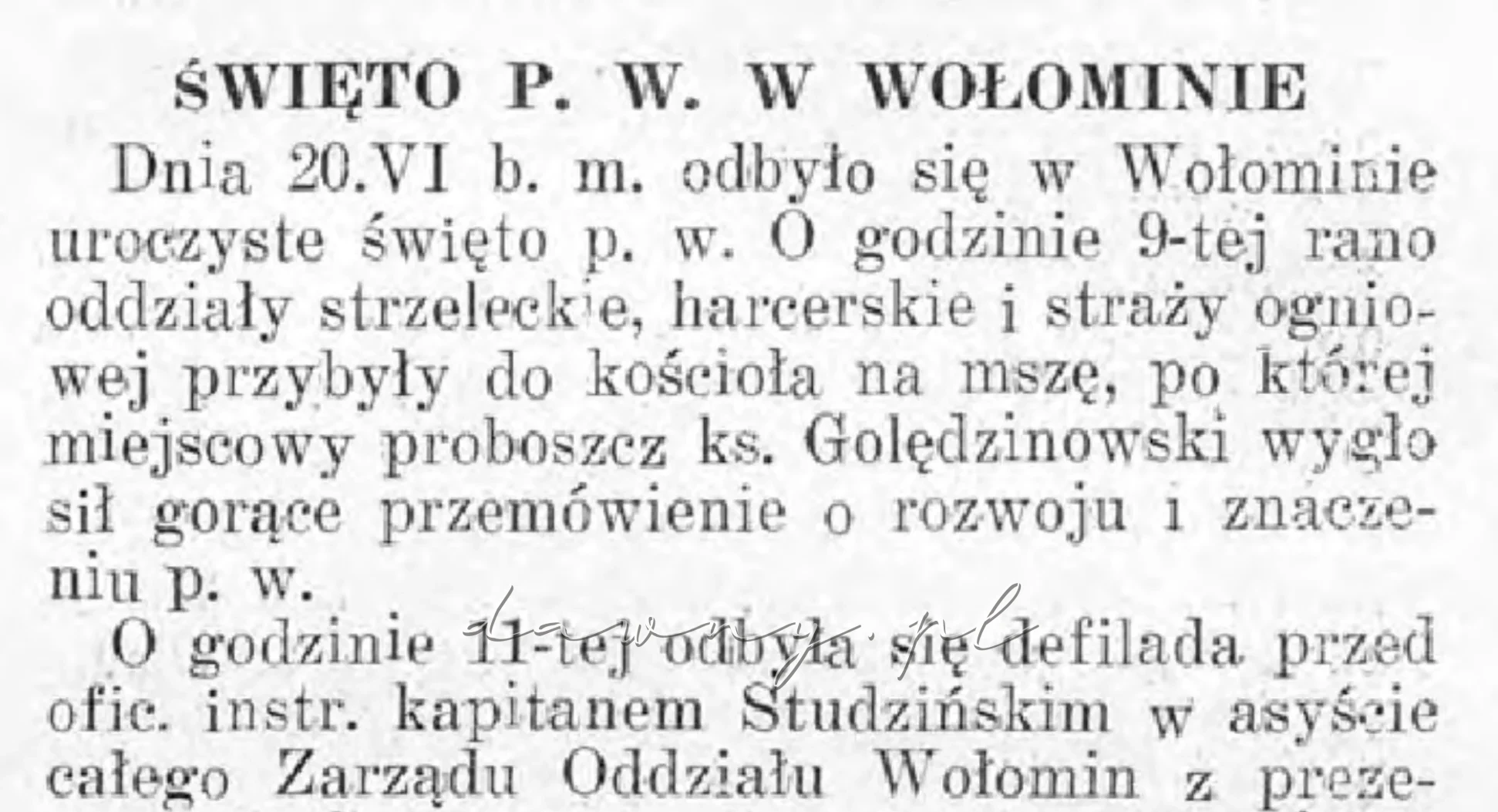 Dnia 20.VI b.m. odbyło się w Wołominie uroczyste święto p. w. O godzinie 9-tej rano oddziały strzeleckie, harcerskie i straży ogniowej przybyły do kościoła na mszę, po której miejscowy proboszcz ks. Golędzinowski wygłosił gorące przemówienie o rozwoju i znaczeniu p. w. O godzinie 11-tej odbyła się defilada przed ofic. instr. kapitanem Studzińskim w asyście całego Zarządu Oddziału Wołomin z prezesem ob. Szczęsnym na czele, przedstawicieli władz miejscowych z burmistrzem miasta Wołomina ob. Czajkowskim, ks. proboszczem Golędzinowskim i komisarzem powiat. Radzymińskiego Maciążkiem na czele.
