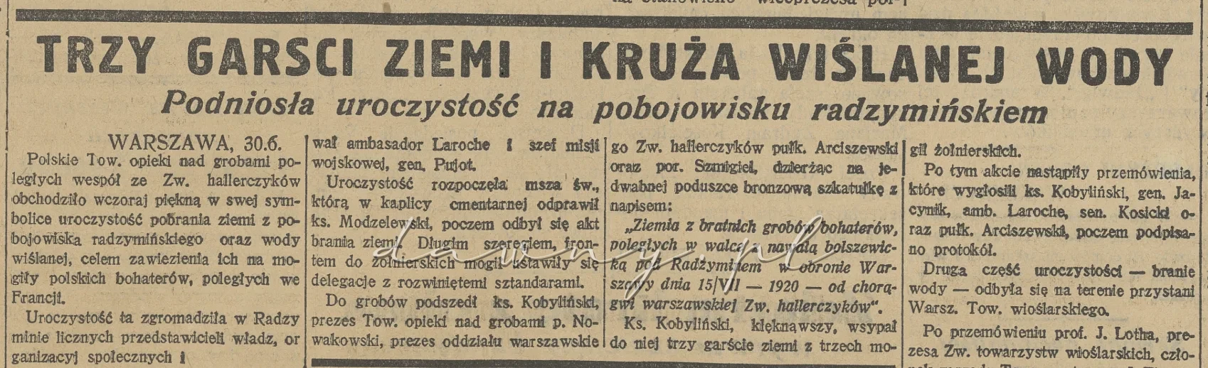 Polskie Tow. opieki nad grobami poległych wespół ze Zw. hallerczyków obchodził wczoraj piękną w swej symbolice uroczystość pobrania ziemi z pobojowiska radzymińskiego oraz wody wiślanej, celem zawiezienia ich ma mogiły polskich bohaterów, poległych we Francji. Uroczystość ta zgromadziła w Radzyminie licznych przedstawicieli władz, organizacyj społecznych i tłumy publiczności, pragnącej wziąć udział w tym podniosłym akcie. Wojskowość reprezentował zastępca dowódcy O. K. gen Jacynik, który przybył w towarzystwie delegacyj wszystkich oddziałów wojskowych, stacjonowanych w Warszawie. Stawili się przedstawiciele Zw. dowborczyków, oddziału. polskiego Fidac’u, emerytów wojskowych, Zw. obrońców ojczyzny, Zw. oficerów i podoficerów rezerwy, władz miejskich, które reprezentował nacz. Kłosowski, Zw. pracowników samorządowych, tramwajarzy oraz wioślarzy i cyklistów warszawskich.
