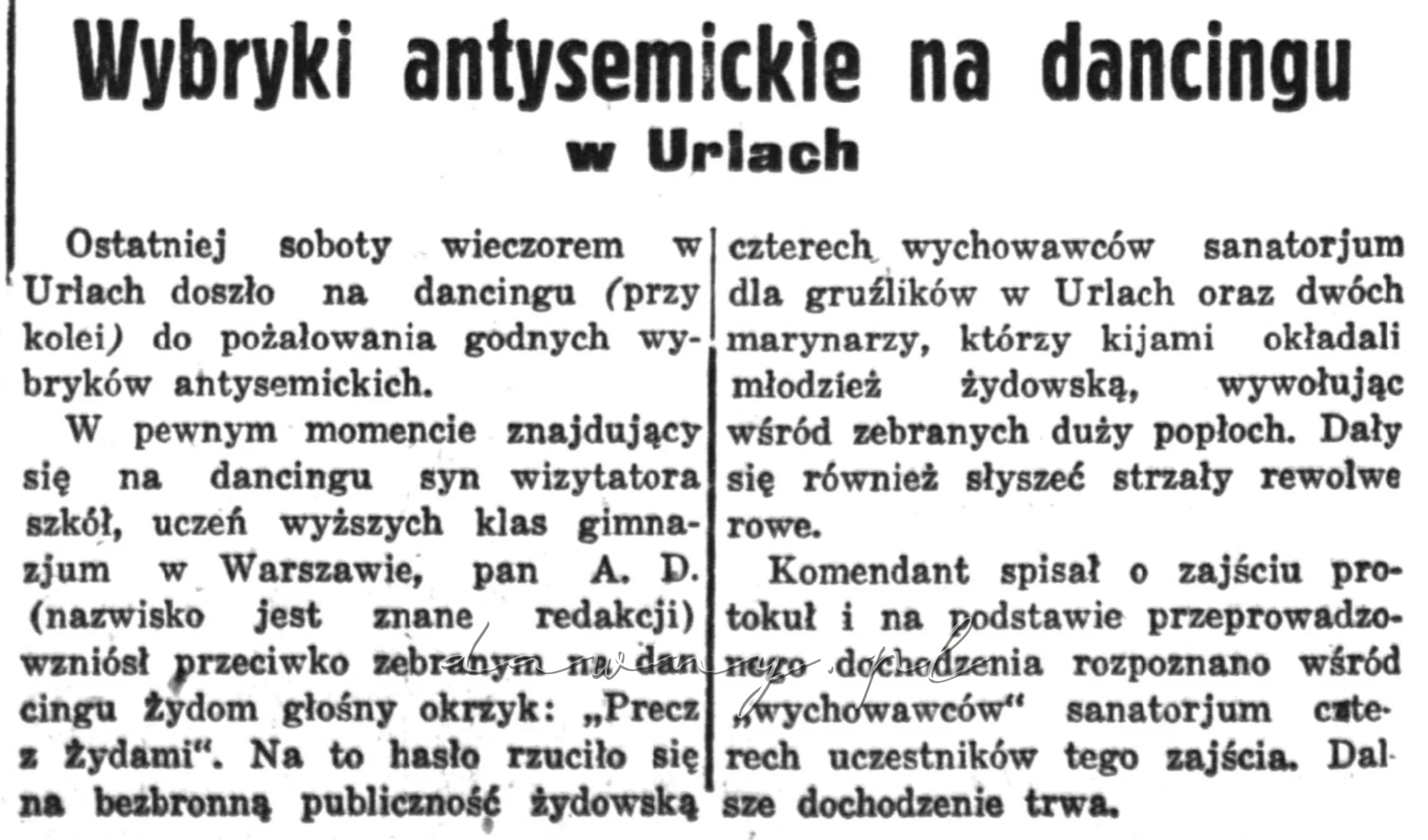 Ostatniej soboty wieczorem w Urlach doszło na dancingu (przy kolei) do pożałowania godnych wybryków antysemickich. W pewnym momencie znajdujący się na dancingu syn wizytatora szkół, uczeń wyższych klas gimnazjum w Warszawie, pan A. D. (nazwisko jest znane redakcji) wzniósł przeciwko zebranym na dancingu żydom głośny okrzyk: „Precz z żydami”. Na to hasło rzuciło się na bezbronną publiczność żydowską czterech wychowawców sanatorium dla gruźlików w Urlach oraz dwóch marynarzy, którzy kijami okładali młodzież żydowską, wywołując wśród zebranych duży popłoch. Dały się również słyszeć strzały rewolwerowe. Komendant spisał o zajściu protokuł i na podstawie przeprowadzonego dochodzenia rozpoznano wśród „wychowawców” sanatorium czterech uczestników tego zajścia. Dalsze dochodzenie trwa.