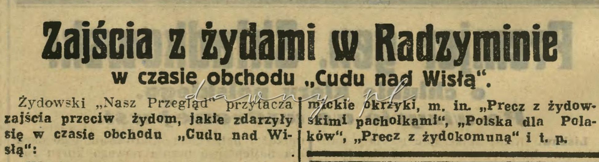 Żydowski „Nasz Przegląd” przytacza zajścia przeciw żydom, jakie zdarzyły się w czasie obchodu „Cudu nad Wisłą”: