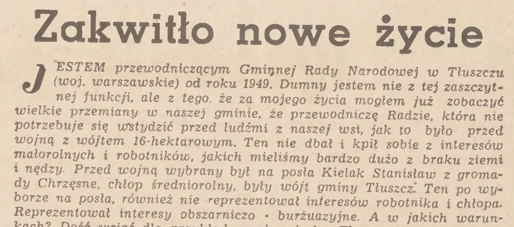 Jestem przewodniczącym Gminnej Rady Narodowej w Tłuszczu (woj. warszawskie) od roku 1949. Dumny jestem nie z tej zaszczytnej funkcji, ale z tego. że za mojego życia mogłem już zobaczyć wielkie przemiany w naszej gminie, że przewodniczę Radzie, która nie potrzebuje się wstydzić przed ludźmi z naszej wsi, jak to było przed wojną z wójtem 16-hektarowym. Ten nie dbał i kpił sobie z interesów małorolnych i robotników, jakich mieliśmy bardzo dużo z braku ziemi i nędzy. Przed wojną wybrany był na posła Kielak Stanisław z gromady Chrzęsne, chłop średniorolny, były wójt gminy Tłuszcz.